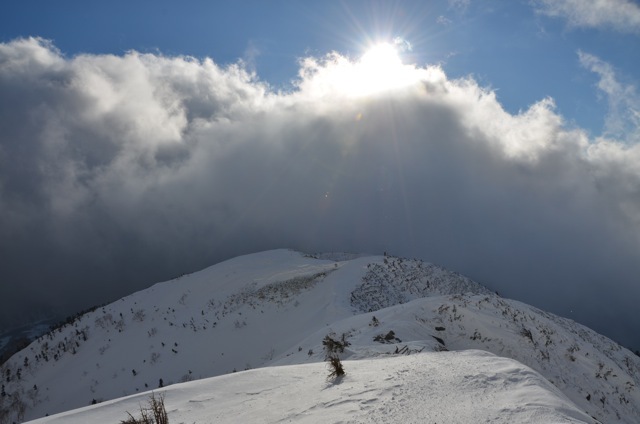 丸山の先の広い稜線まで下りると再び日が射すようになりました。