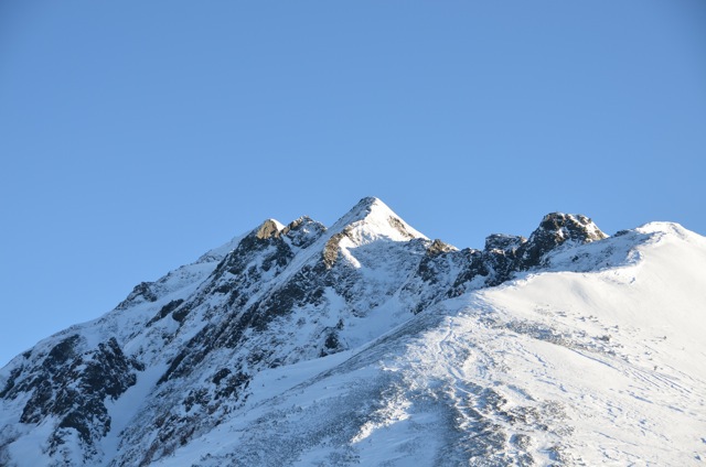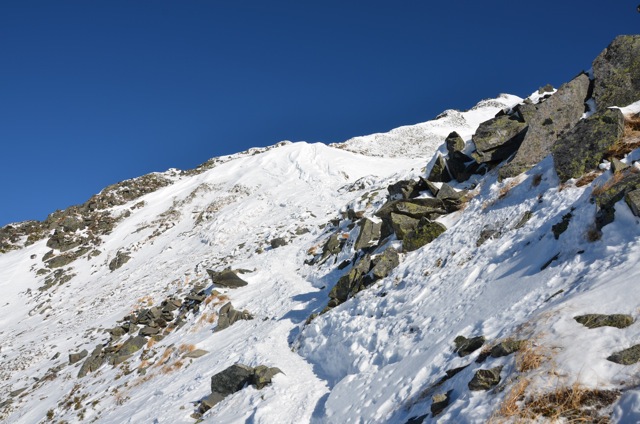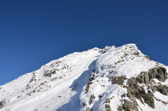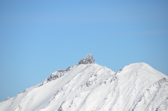 ここから先は雪質により難易度が全く違います。場合によってはザイルが必要な場合もあります。今回はアイゼンが確実に雪面を捕らえて行きますので、あとはバランスを崩さないように慎重に進みます。