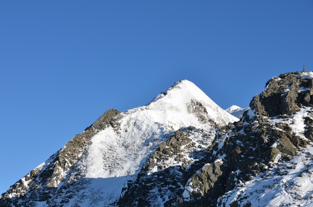 でもって反対側をみるとピラミッドピークへ続くトレースがついています。このトレースを追って行くと丁度写真の中央よりちょっと上の辺りになりますが白く盛り上がっている部分があります。ここが最初の難所です。