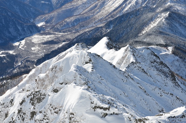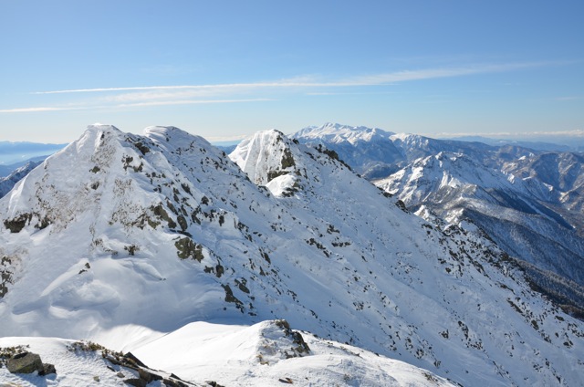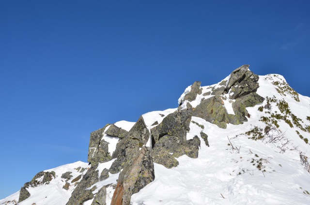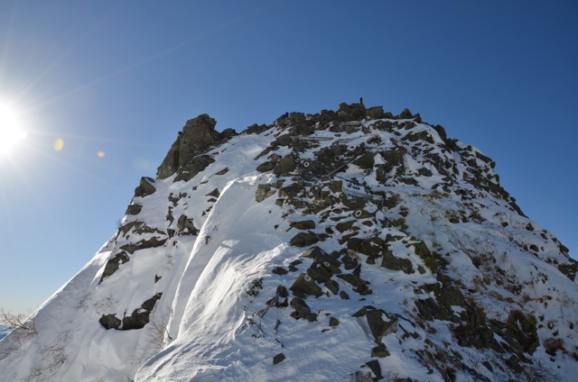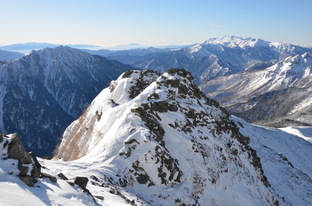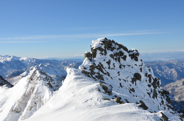 独標から第9峰は意外に難易度が高いような気がします。岩と雪のミックス状態の場所をアイゼンを付けて通れる技術が必要です。あとは、度胸も必要。なんせ滑ったら全てが終わりだからです(怖)