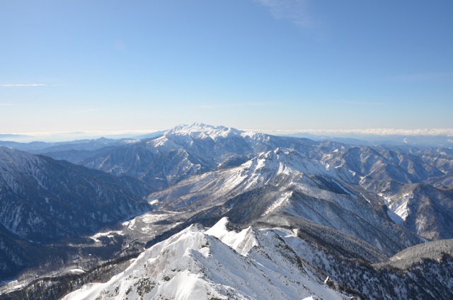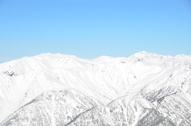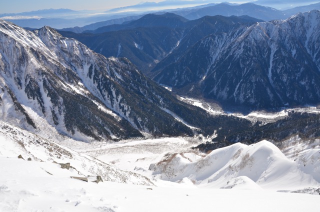 遥か遠方に見える雪をかぶったのが乗鞍岳。手前には雪をかぶった焼岳。