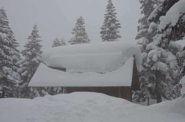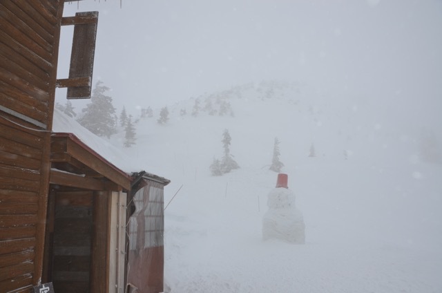 屋根に積もった雪が今にも落ちてきそうです。この小屋を見ると、登山時は「よしがんばるぞ!」という気になれますし、下山時は「あ〜、帰ってきた」という気になります。なんだか不思議なものですね。
