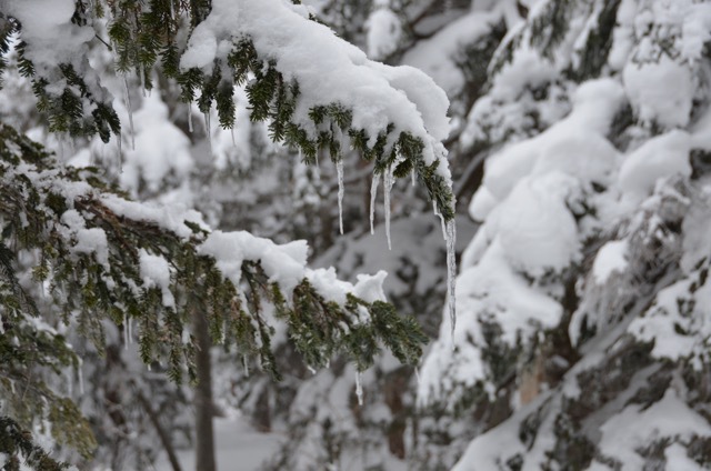 これはまた珍しい光景です。私が冬山に登る中では初めて見ます。木の枝からつららが垂れています。これは私の勝手な予想ですが、今年は異常に気温が高い日があったので、一旦木に積もった雪が溶けてたが、すぐに気温が下がって凍ってしまったのではないかと考えました。ま、実際はわかりませんが。ただこの時期にしては異常に気温が高くて雪でなくて雨が降った日があるというのは事実のようですし。