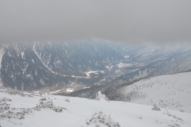 登る時は気づかないのですが、下山時に改めて見るとちょっとびっくりします。峰の上は雪庇が張り出しているので、あまり信州側は歩かないほうが良いです。今回は飛騨川から暴風が吹き付けているのでかなりスリルがありました。