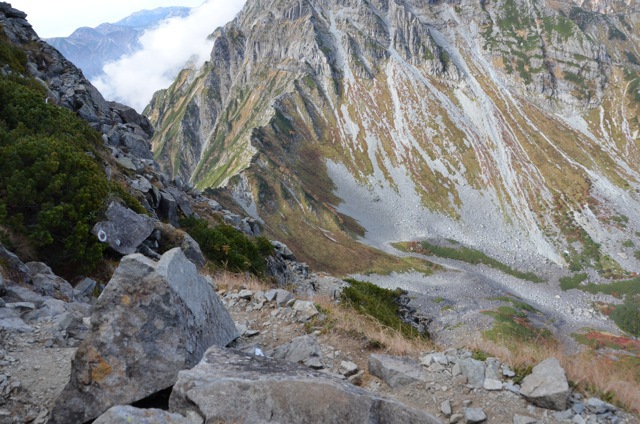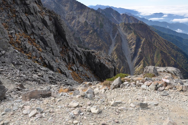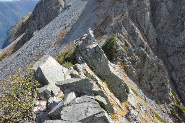 ほんのちょっと下りただけですが、こんなに高度が下がりました。この部分はザレているので、とにかく滑らないように慎重に下りて行きます。