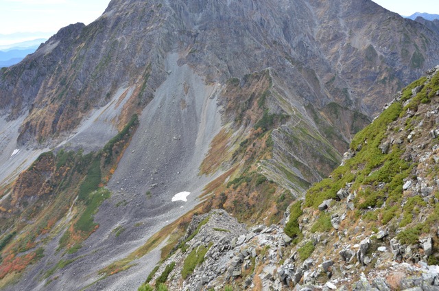 大キレットの終点である北穂高岳と今自分がいる崖の間には深い谷があるんだという事に。そう、直線では近いのですが、北穂高岳へいくには巻いて行かなければならないのです。