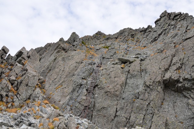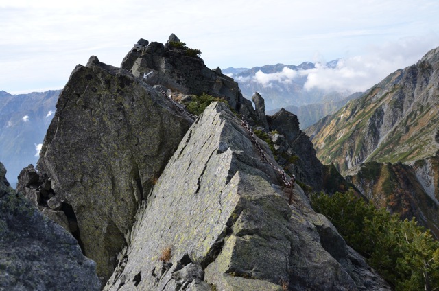 長谷川ピークのてっぺんを過ぎてちょっと進んだところのこの下りが自分的には一番怖かったです。踏み外したら最後。岩や打ち込んであるステップを握る手は手袋をはめていても滑ってしまいそうな恐怖感。