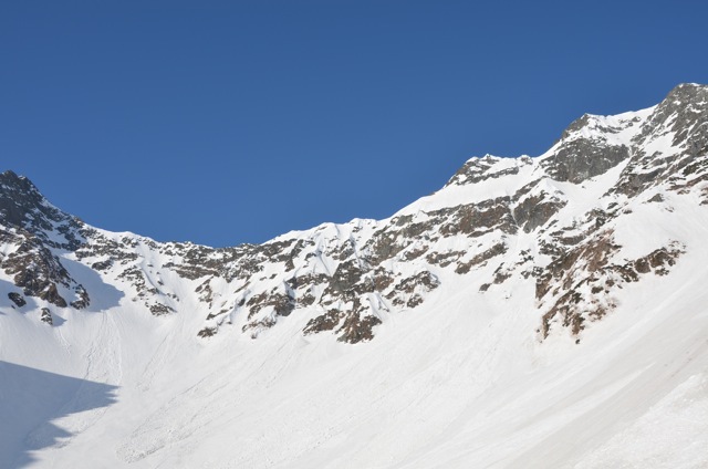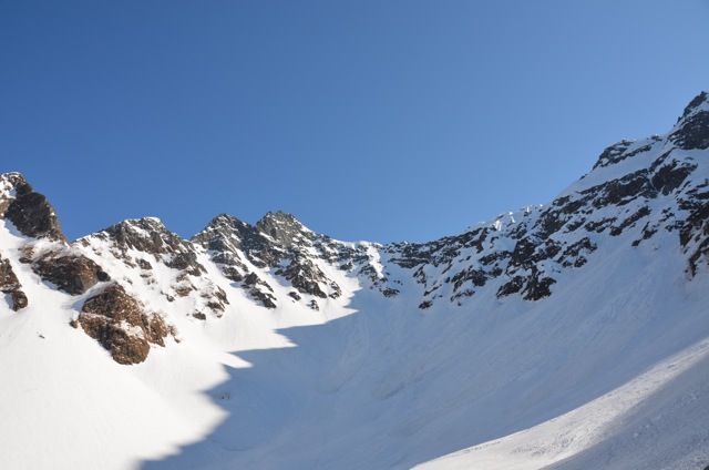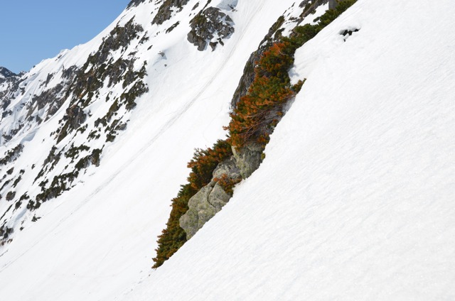 この時期は雪が柔らかくなって雪崩が発生しやすいです。よく見ると色々なところで亀裂ができており雪崩予備軍がたくさん待機してました。