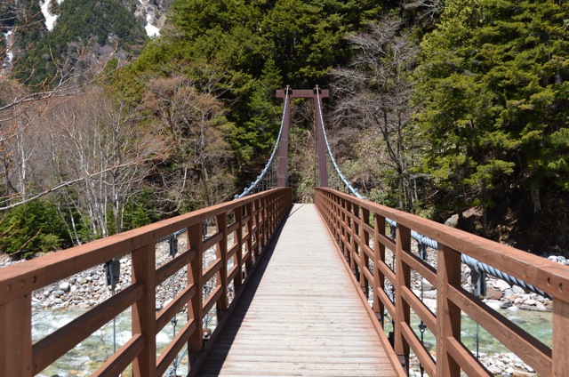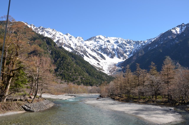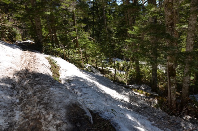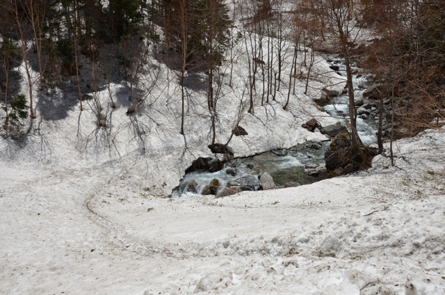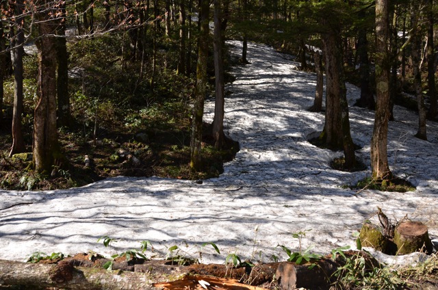 横尾まではひたすら梓川沿いに歩いて行きますが、場所によってはまだこんなに雪が残っています。