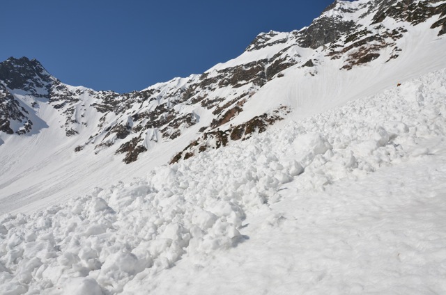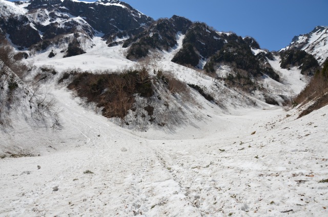 写真は雪崩の跡。デブリともいいます。遠回りになったとしてもデブリは避けて行きます。