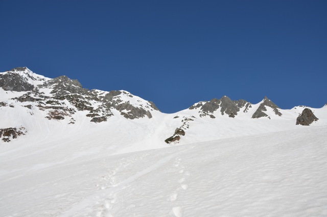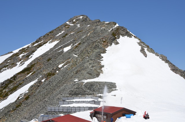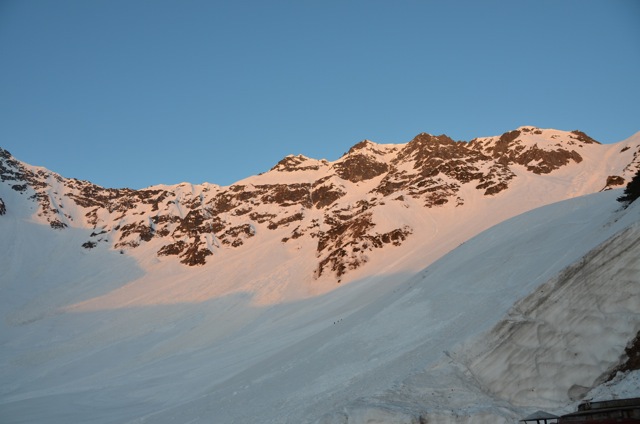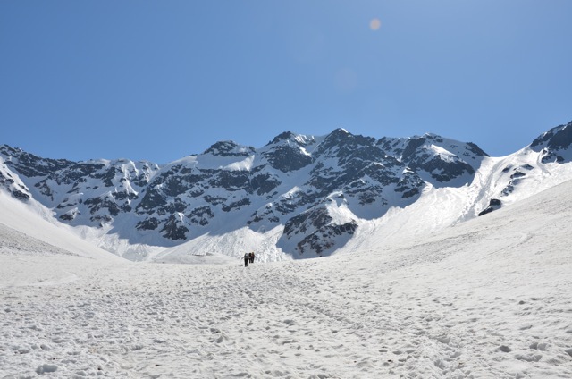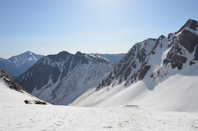 目的地は穂高岳山荘。写真の中央にくぼんだ部分(コル)がありますがそこに山荘があります(この次期は半分雪で埋まっているので、涸沢からは見えませんが、夏の時期は山荘の屋根がはっきり見えます)。