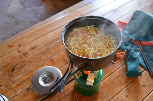 軽量化重視のためその他の具材はありません。っていうかこれ本当は緊急時非常食で持ってきたラーメンなんですが、想定外出費があった関係で山荘で軽食を注文するのを見合わせたという情けない結果なんです・・・