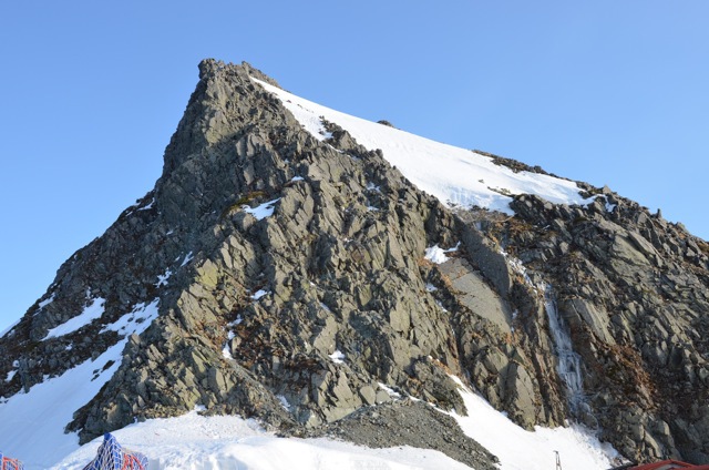 本来、垂直の氷壁を登るための登攀用具であるアイスバイルは、奥穂高岳登山者を拒む最後の難関である雪渓を確実に捕らえて行きます。