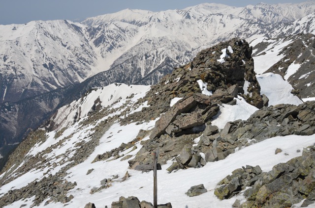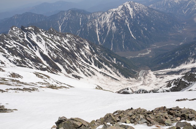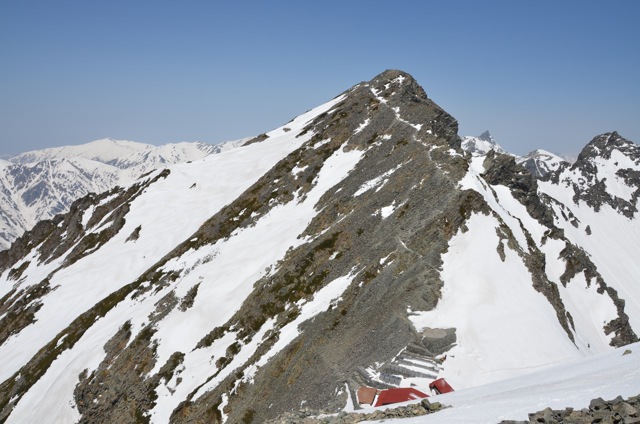 写真中央の巨大な岩(コブ?)の裏手が先ほどの大雪渓です。
