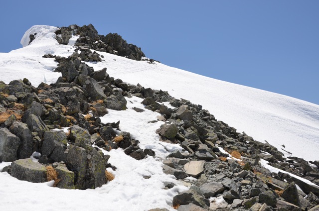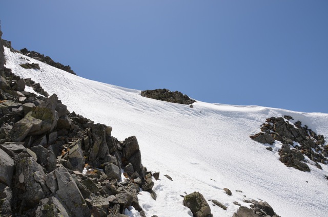 岩場を登ると今度は写真の上の方に見える雪渓を登ります。2カ所ある雪渓の最初の雪渓です。ここで滑ってしまうと写真の右下の方へ一気に滑落てしまいます。