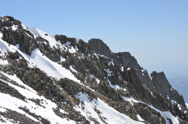 ちなみに、この雪渓は写真の右下に向けてずっと続いているので、万が一滑ってしまった場合は数百メートル止まる事無く真っ逆さまに滑り落ちてしまいます。まず助からないでしょう。