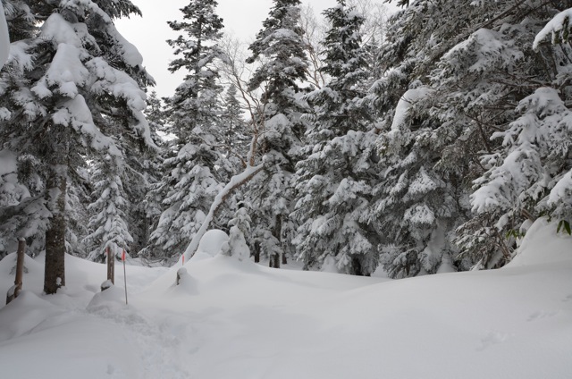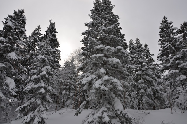 当然ですが雲ひとつない晴れた冬山というのは美しいの一言に尽きます。が、静かに雪が降り積もるこの森林の姿もまた良いのもです。