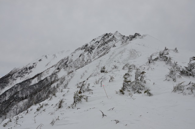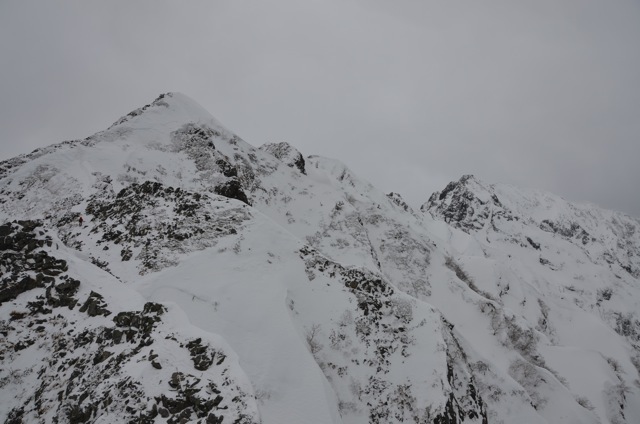 雪がついているので分からないのですが、実は非常に痩せ尾根です。そう、お分かりの方も多いと思いますが雪庇が張り出しているのです。