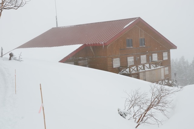 まずは受付を済ませます。明日の気象条件を聞きますが天気は良いとのことです。例のごとく軽食を摂り少し休憩します。受付の際は一度稜線に行って戻ってきてから部屋を案内してもらうことにしましたが、休憩しているうちに腰が重くなってしまい、しかも風が出て雪が降ってきたので、今日は稜線に行かず小屋でゆっくりすることにします。
