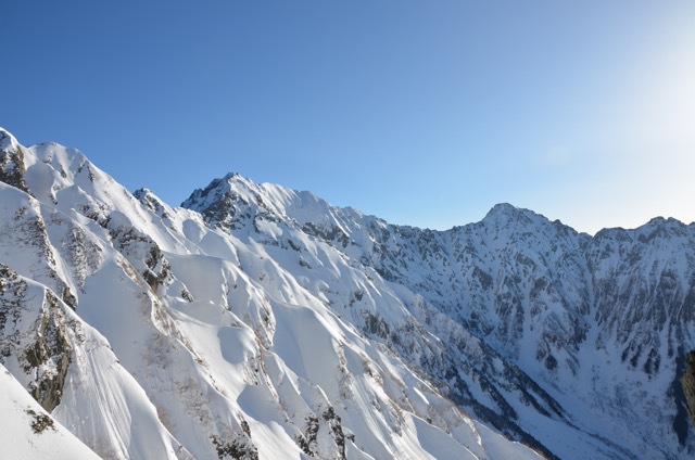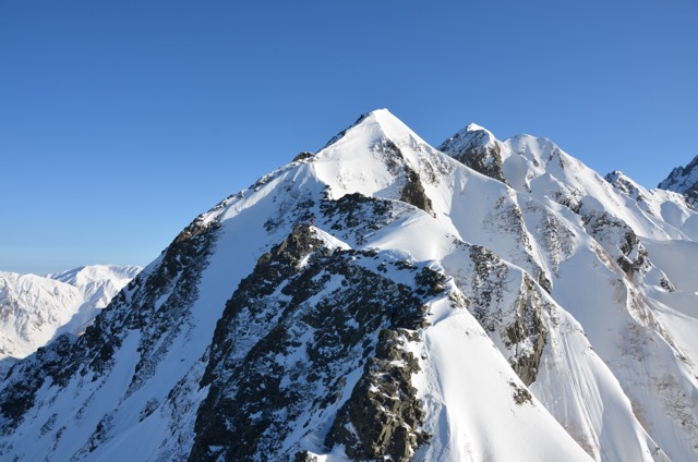 写真では少しわかりづらいかもしれませんが、独標手前の第12峰の一部が写っています。通常夏季はこの第12峰は巻いていくのですが、この時期は雪が積もっているおかげで峰の上を越えていくことができます。慣れない方はこちらの方が緊張感があるかもしれませんね。