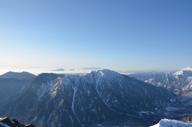 ロープウェイもよく見えています。何度もロープウェイを乗ってきた中で一番観光客の受けがいいのが、山頂駅部分が雲海の上に出ている時です。麓からだと今日は天気が良くないと思ってしまうのですが、山頂駅近くになると雲海から抜け出し、西穂の真っ白な稜線が姿を表すと歓声が上がります。