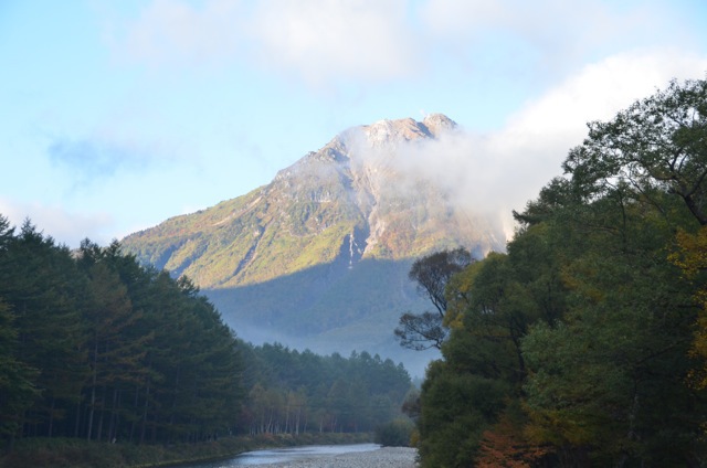 河童橋からは岳沢側を撮影する人が多いのですが、今日は反対側の焼岳がよく見えていましたので、反対側を撮影してみます。
