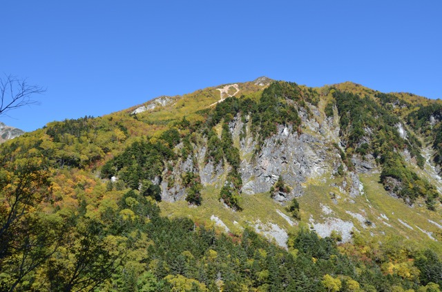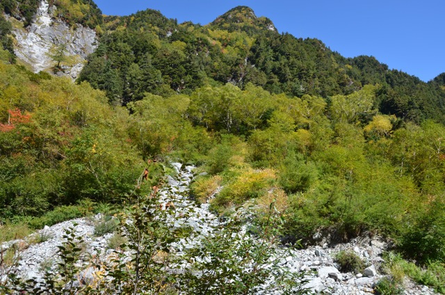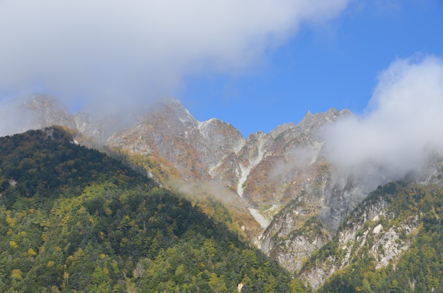 まだ体が温まっていないのでソフトシェルジャケットを着た状態で歩き始めます。の〜んびり景色を楽しみながら、でも上高地の辺りはまだ紅葉には速いようです。