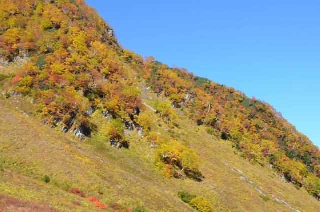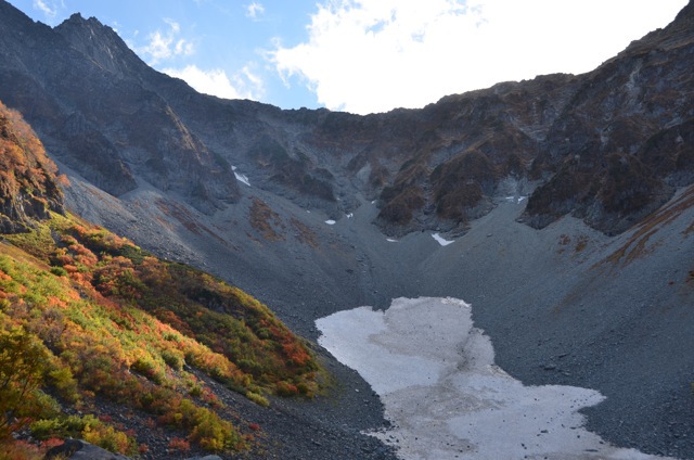 7月の下旬に来たときはまだ、雪渓の上を登って行った写真の場所も今ではすっかり赤や黄色の美しい姿となっています。