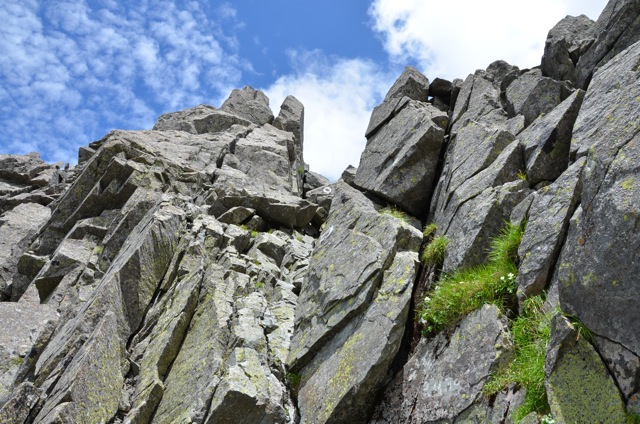 北穂高岳は最初は普通に登って行くのですが、突然スラブ状の岩をよじ上って行くような場面に遭遇します。初めて来る方は必ず動揺するのではないでしょうか(・・・ってカッコつけるな〜)。
