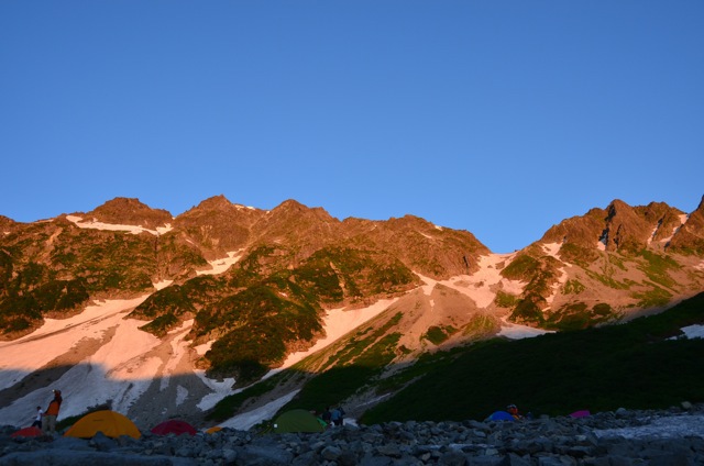 しかしそれが穂高連峰の縦走となると全く別の話。北穂高岳から涸沢岳の縦走という非常に難易度の高いコースを含む3日目は、この時期にしては貴重なモルゲンロートをもって始まったのでした。