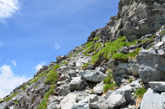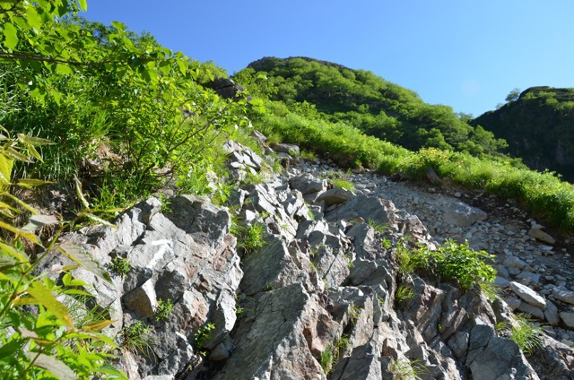 ここでカメラをザックの中にしまう事を決意します。この写真は一眼レフの望遠レンズ付きカメラで撮影しており、この重量物を首からぶら下げて歩いているのですが、この状態で写真の崖を登っていくのは不可能と判断しました、っていうか崖の途中で撮影などする余裕は無いです。
