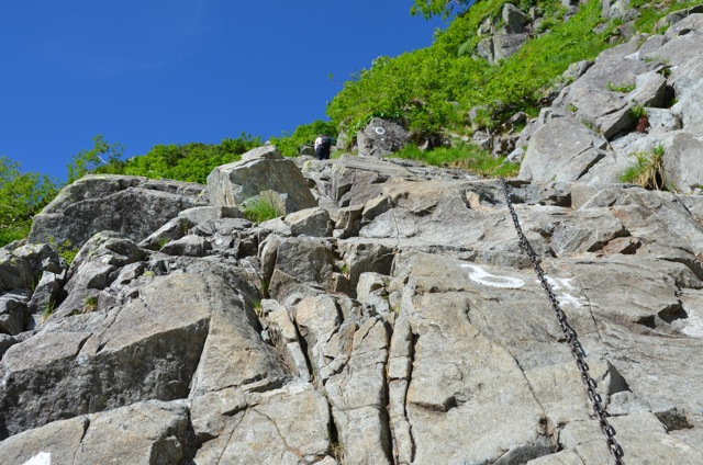 どこから登るんだ〜 って叫びたくなります。ほぼ90度の崖を連続する鎖とハシゴをたよりに登って行く危険地帯です。