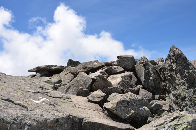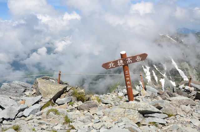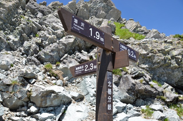 北穂分岐です。北穂高岳北峰(いわゆる北穂高岳の頂上、北穂高小屋があるほう)と北穂高岳南峰を経由して奥穂高岳への分かれ道です。