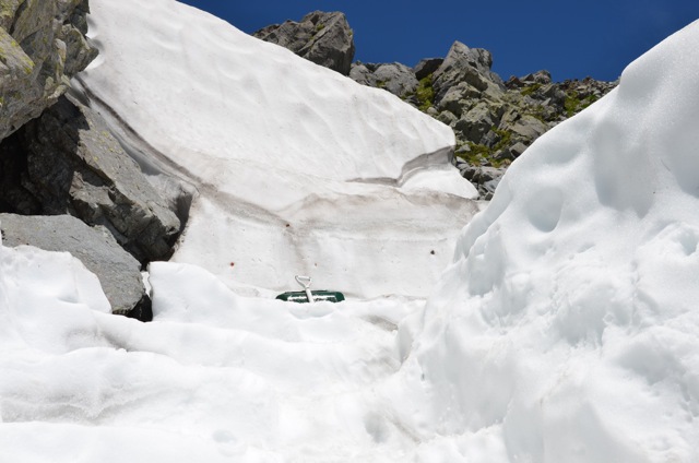 北穂高岳北峰へ向かうとすぐに雪渓を横切ります。この時期にこんだけ雪が残っているのも珍しいです。