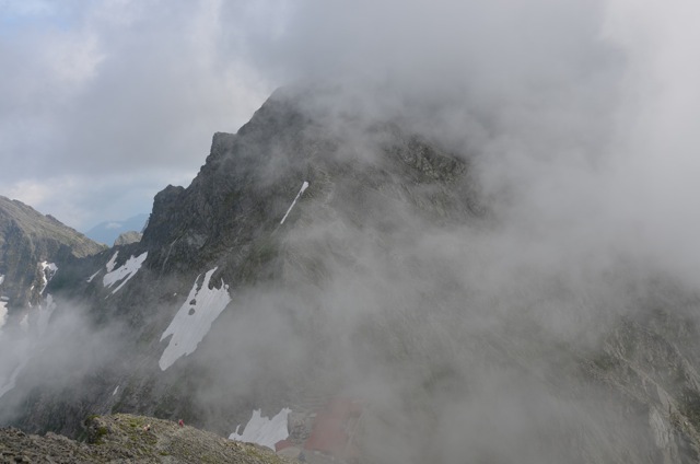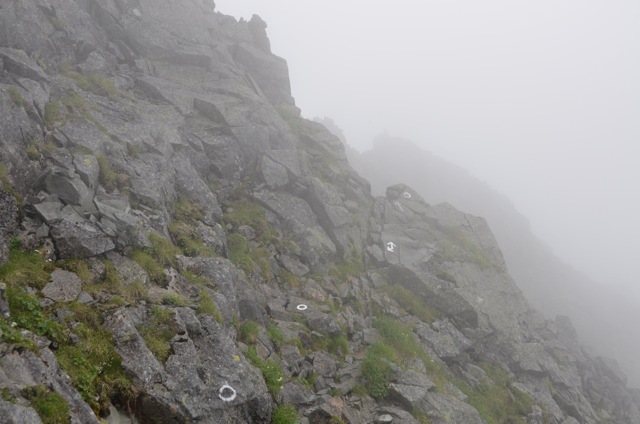 急に霧に包まれたので視界が悪くなり高度感がなくなります。良いのか悪いのか分かりませんが。ただ、下が見えないというだけで絶壁のただ中にいるという事実は変わりませんので・・・