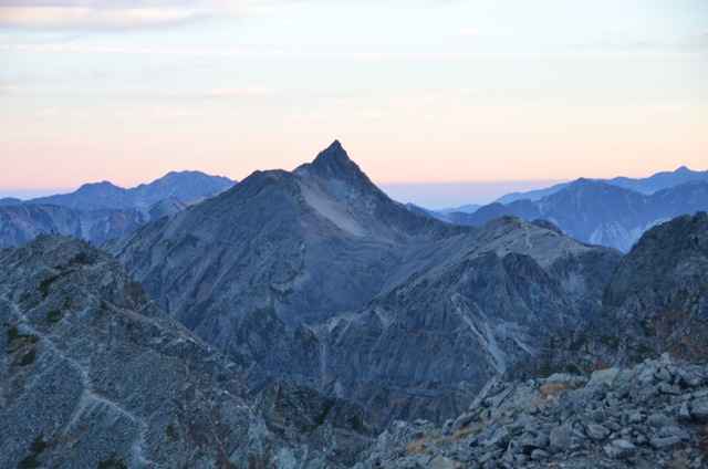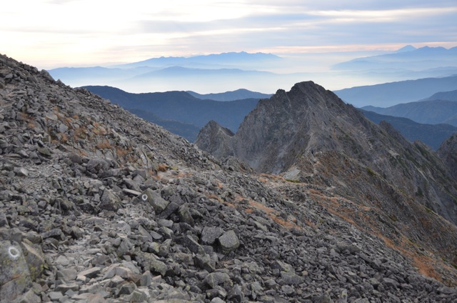 ヘッドライトをしまい、朝の北アルプスを堪能します。起床してすぐに飛び出してきたようなものなので、ちょっとだけ辛いです・・・ 息がすぐに上がってしまいます。