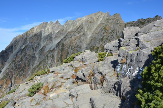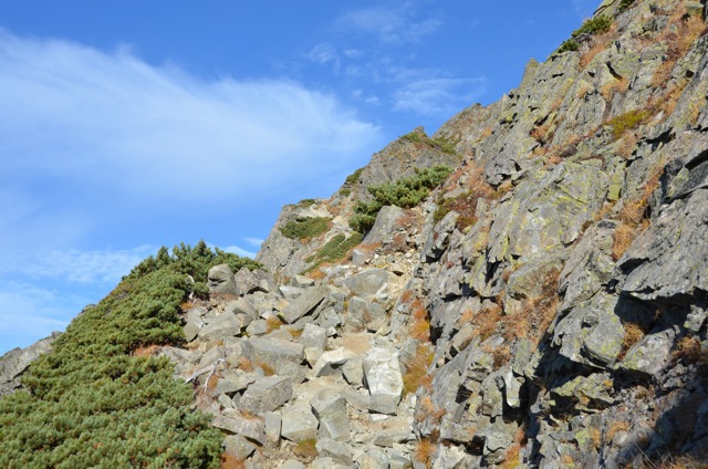 あとは写真のような急なガレ場や岩場を登ったり下りたりを繰り返して紀美子平へ到着します。