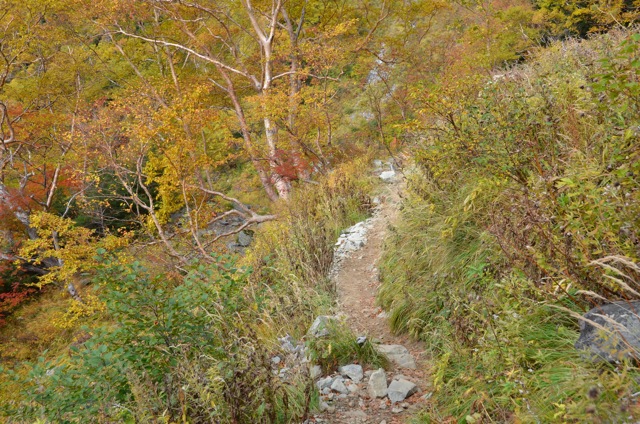 涸沢とはまたひと味違った紅葉の美しさがあります。思わず立ち止まって見とれてしまいました。