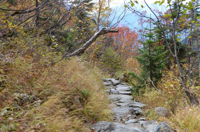 森林帯に入ったものの、意外に視界が開けていて明るいです。とくに今回は紅葉が綺麗な部分もあり、とても楽しめました。