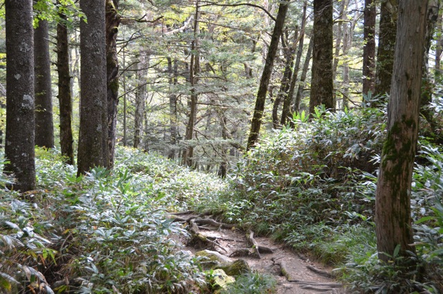 岳沢小屋から上高地はとくに危険な箇所はなく、写真のような道をひたすら歩いて行く形になります。