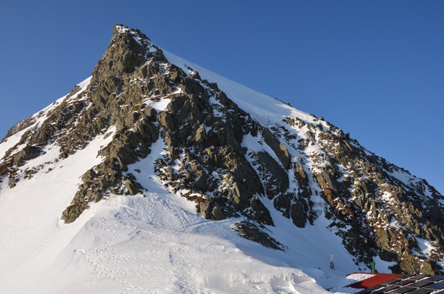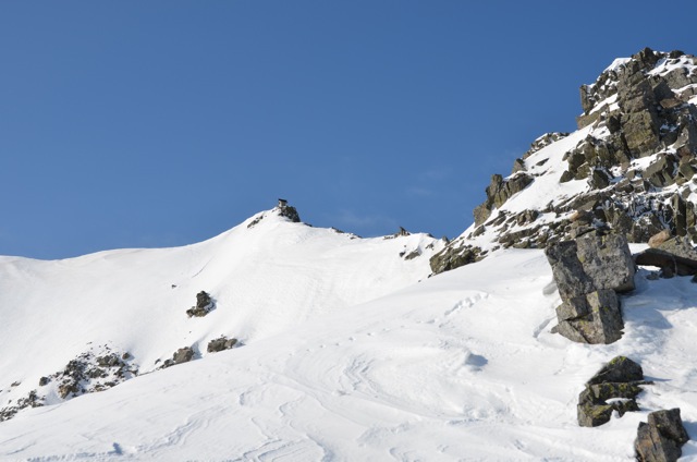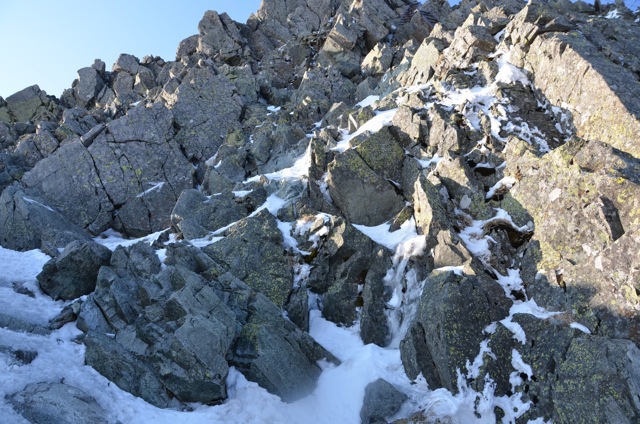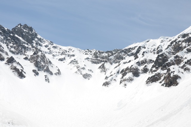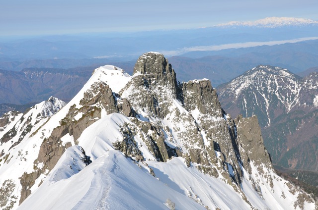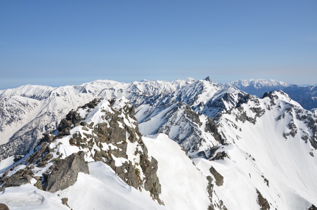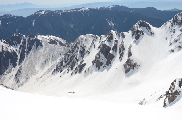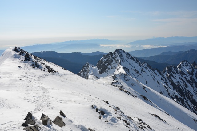 前穂、紀美子平方面はこの稜線を進みます。重太郎新道を通って直接上高地に下山できるコースですが、この時期は大変危険ですので遠慮しておきます。