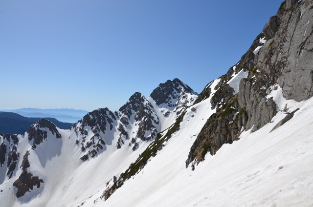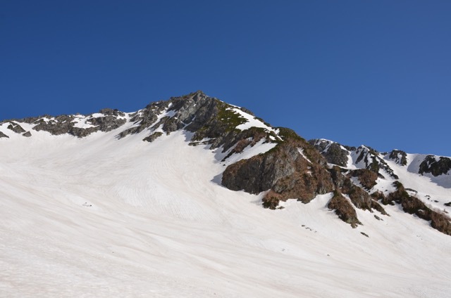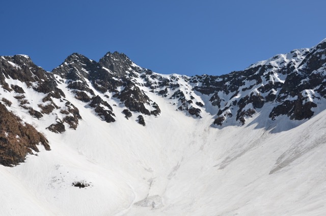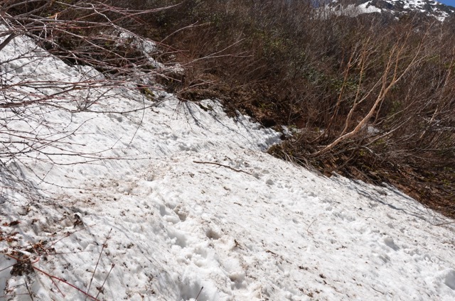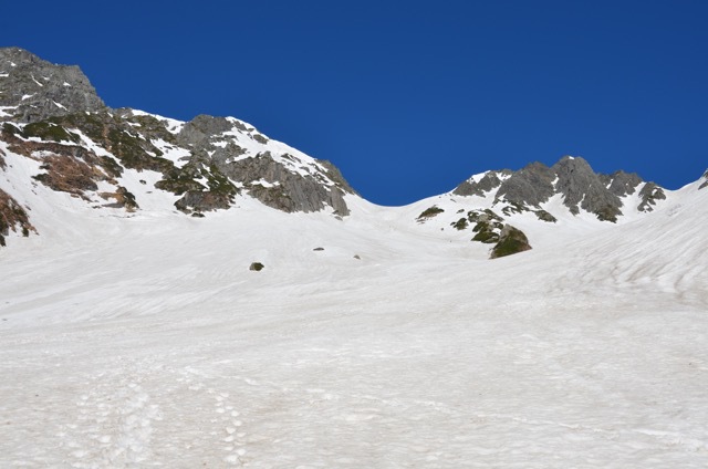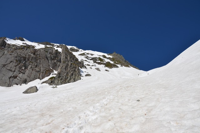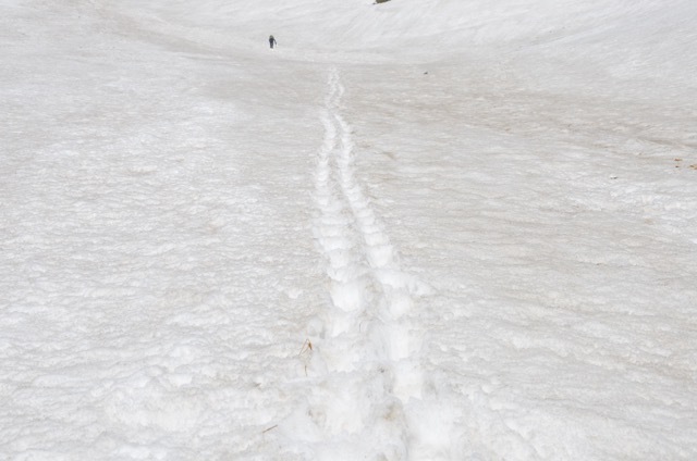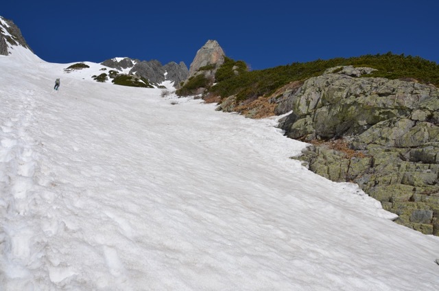 写真のような雪渓を何度もトラバースすることになります。そんなに斜度があるわけではないので雪渓のトラバースに慣れている方なら問題はないと思います。