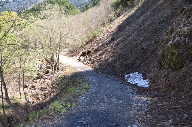 本谷橋を渡って少し登るとご覧のように雪が出てきます。
