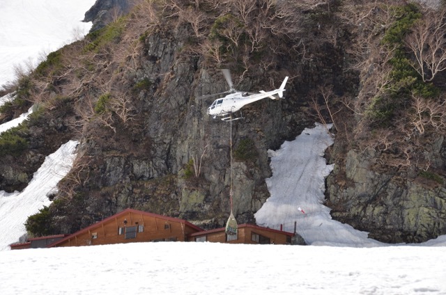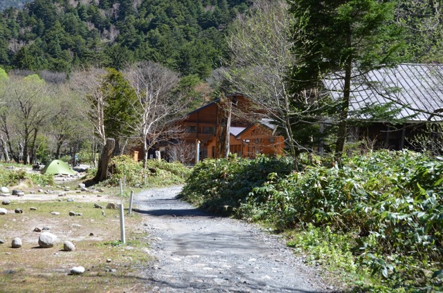 通常この時期は横尾付近になるとまだ雪が残っていて通れないので、川沿いの搬入路に迂回する形になるのですが、今年は雪が全くないため迂回する必要がありません。