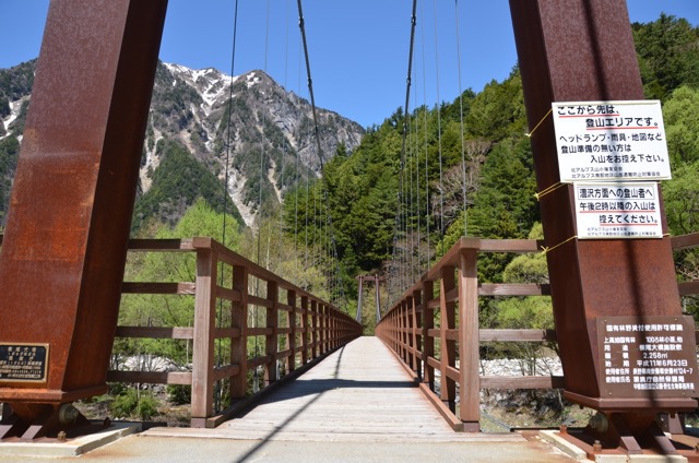 橋の欄干にも掲示されていますがここから先はどちらの方面に向かっても登山道になります。さすがにここまで来る観光客は見たことがないですが、横尾の手前の徳沢では子ども連れの家族がテント張ったりしていてレジャーできている方が多かったので、そんな方々が間違って登山道に踏み入れたりしたら危ないですからね。