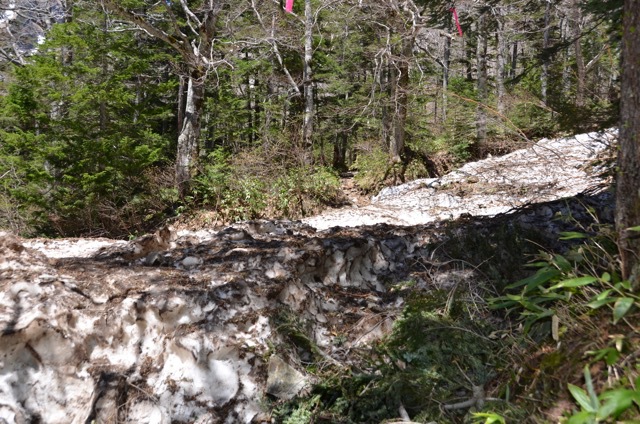2カ所の雪渓もだいぶ薄くなっていて、帰りにはうち1カ所が崩落していて安全なルートがマーキングされている状況でした。