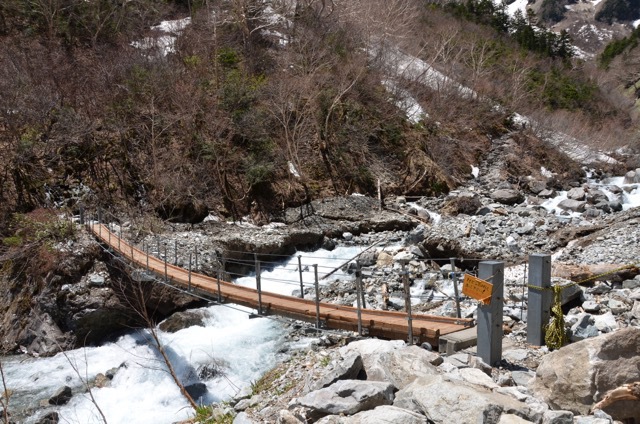 ハイシーズンには絶え間なく登山者が行き交うこの横尾大橋も今日は誰もいません。のんびりと橋を越えていきます。