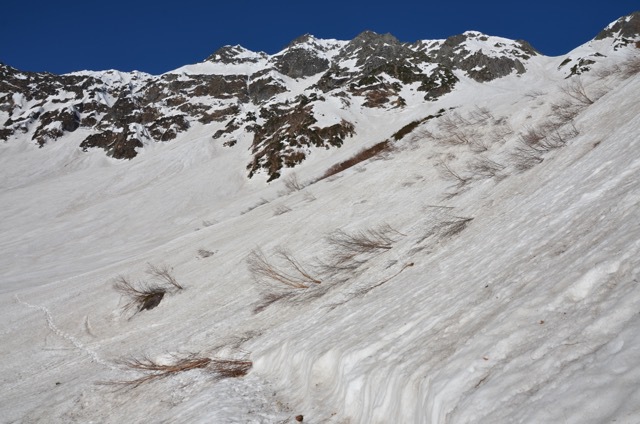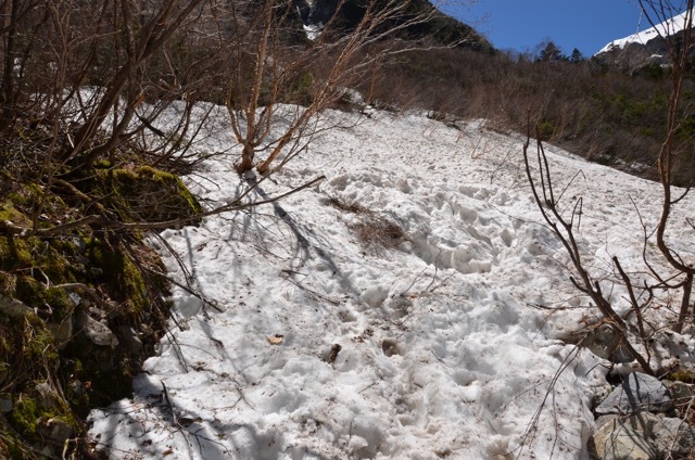 あまりにも雪が少ないので横尾から涸沢の登山道は谷底を通る冬季ルートが使えず、夏道をトラバースしていくという今までに経験したことのない状況となっていました。雪渓のトラバースそのものは冬の西穂高でこれでもかというくらい訓練されてきたので問題はないのですが、やはり緊張感はあるものです。