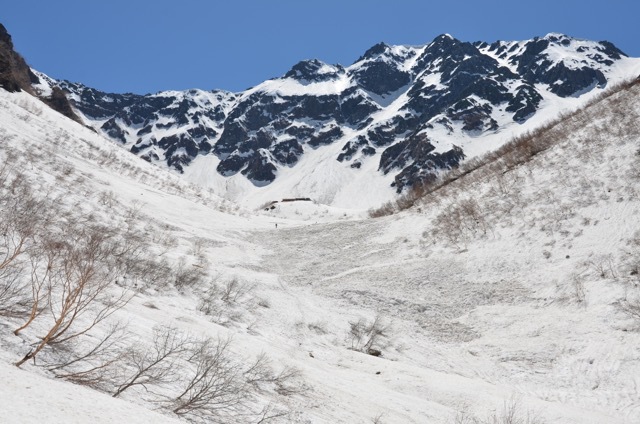横尾から本谷の橋がかかっている場所まで雪があるのは写真を含む2カ所の雪渓のみです。あとは完全な夏道になっています。