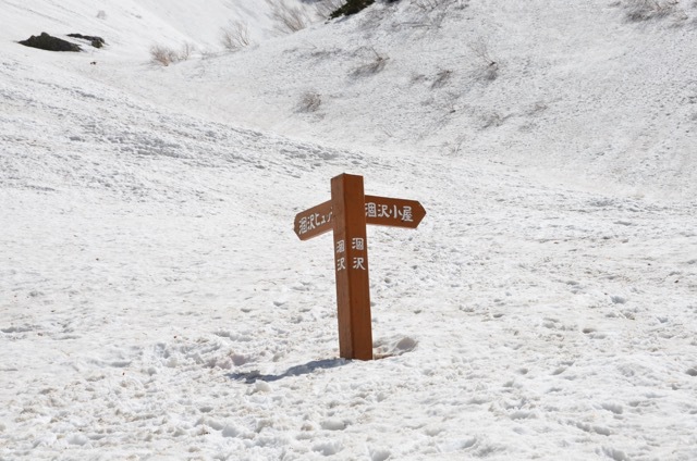 夏道だとこの道標から二手に別れるのですが、この時期は道という概念がないのでこの道標を目印にそれぞれの小屋の方面へ登っていく形になります。